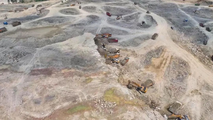 前期爆破剝離工序后,徐工20噸挖掘機(jī)搭配140的小破碎錘進(jìn)行二破,同時(shí)XE380GK、XE600GK等機(jī)型進(jìn)行挖裝作業(yè)?,F(xiàn)場共投入挖掘機(jī)50多臺(tái),每天的挖方量在10萬方左右。