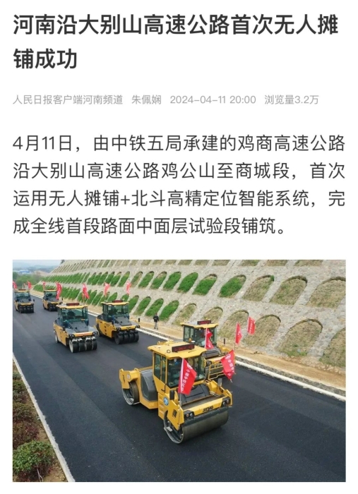 此次試驗段是沿大別山高速公路雞公山至商城段JSSG-2標,首次運用無人攤鋪+北斗高精定位智能系統,完成全線首段路面中面層試驗段鋪筑。