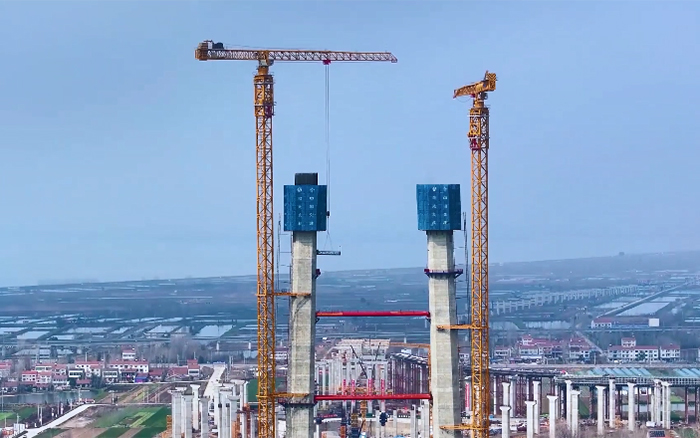 大橋主墩建設是整座大橋順利完工的“壓艙石”,大橋北主塔高度211.75米,采用主塔鋼筋部品整體吊裝。作為徐工超大塔中的明星產品,兩臺徐工XGT2230A-100S扛起大橋北主塔的施工重任。