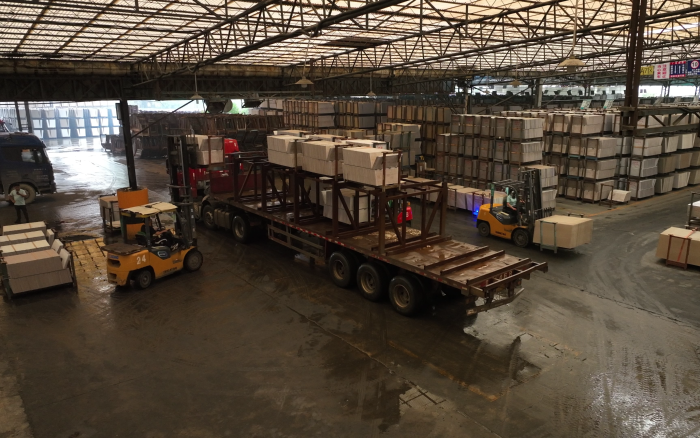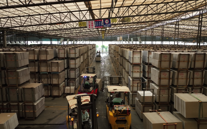 在華南區某大型陶瓷廠內,十幾臺徐工重載高壓鋰電叉車正在進行繁忙的搬運裝卸工作,為即將到來的市場旺季做好準備。