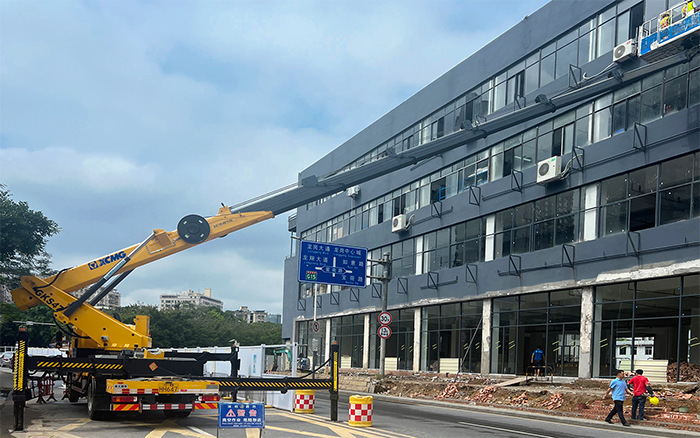 近日,一臺GKS47高空作業車化身“大力神手”,現身深圳街頭某新建商鋪街區對面,助力商鋪建筑外墻施工及水電線路管道安裝。