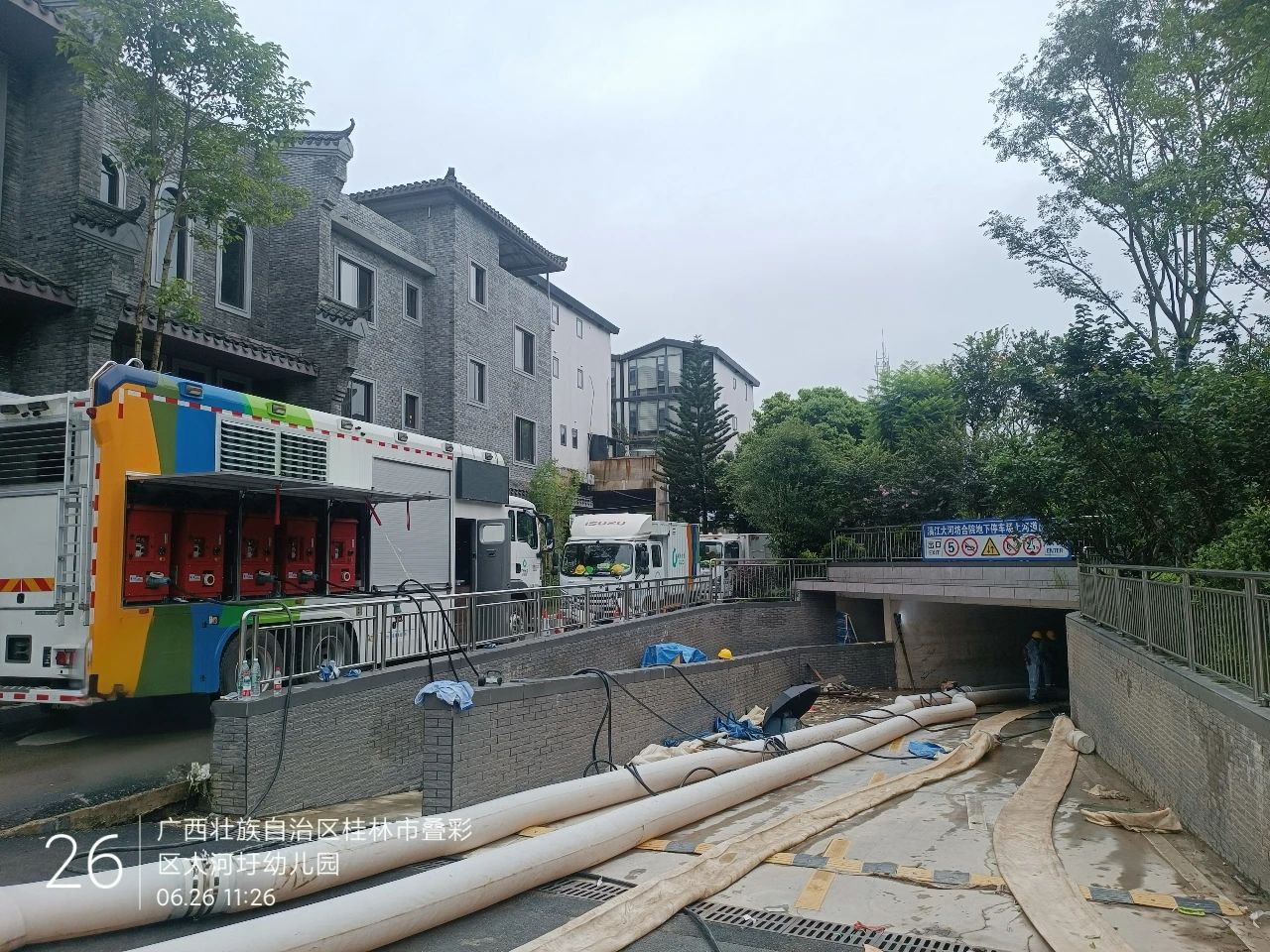 除桂林站地下停車場之外,徐工排澇產品還參與了桂林丹桂府小區以及大河圩旁的地下車庫內澇救援任務。