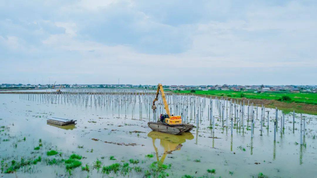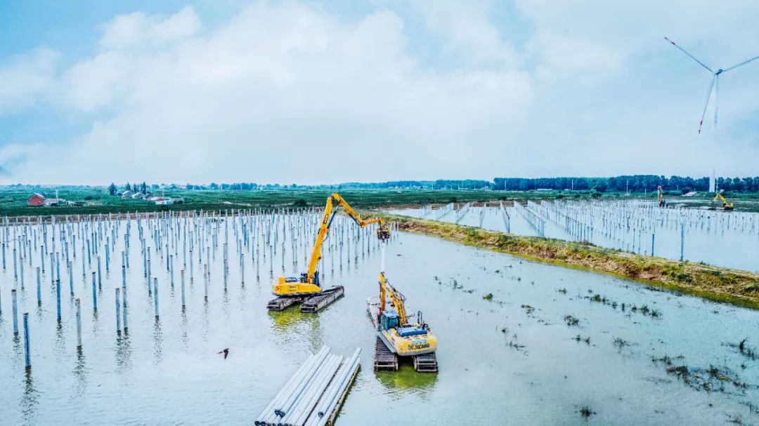在漁業(yè)較為發(fā)達的濱海港鎮(zhèn),“漁光互補”光伏發(fā)電項目建設(shè)正如火如荼,項目現(xiàn)場,徐工水上打樁機的身影隨處可見。