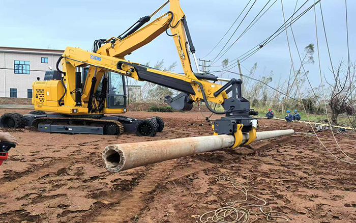 徐工開(kāi)挖立桿一體機(jī)產(chǎn)品一車(chē)多能,平均每次新立電桿作業(yè)僅耗時(shí)20分鐘,是砼桿組立施工作業(yè)的革新式產(chǎn)品。相較傳統(tǒng)作業(yè)人力、吊機(jī)與挖機(jī)配合的方式,更具通用性、高效率和安全性,為本次臺(tái)風(fēng)搶險(xiǎn)救援行動(dòng)節(jié)省了大量的人力和時(shí)間成本,獲得施工方的高度認(rèn)可。