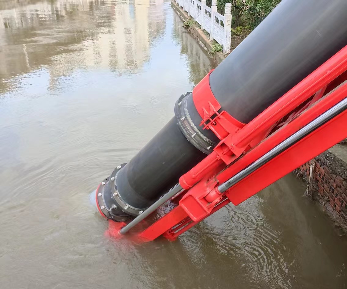 在研判現(xiàn)場(chǎng)情況后,救援人員將垂直式排水搶險(xiǎn)車GP35C臂架舉升、越過(guò)欄桿,后方水平跨障4m、垂直跨障1.5m,火力全開(kāi)抽排水,24小時(shí)晝夜不停,將三龍支河河道內(nèi)的水加速排入龍河。截至20日下午五點(diǎn),GP35C鼓足馬力,平均流量達(dá)3000m3/h,兩個(gè)出水口各連接60m水帶,共計(jì)抽排水27小時(shí),累計(jì)排水量超80000m3。