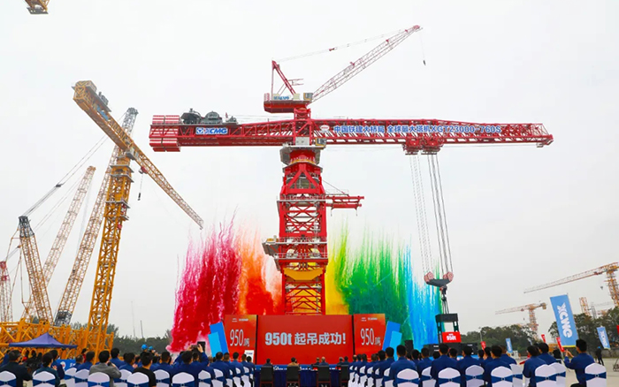 儀式現場,全球最大塔機XGT23000-760S順利完成1.25倍動載起吊,吊裝重量達到950噸。