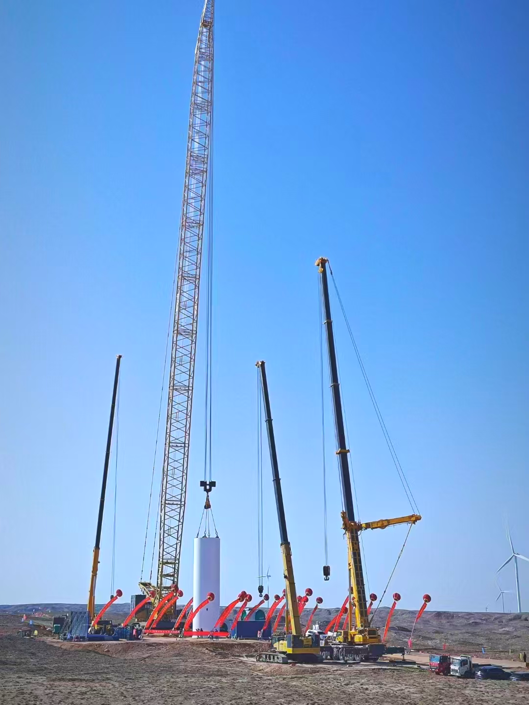 隨著施工號角吹響,各臺起重機緊密配合,XLC18000M采用138+8m的標準風電工況,穩穩將98m長的葉片與112t重的輪轂、葉片在百米高空精確連接到機艙,XGTC160-I、XCA600L8 和 XCA200L8_2則靈活調整位置,輔助完成關鍵部件的吊裝,整個吊裝過程精確無誤。