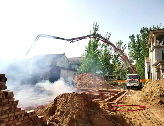 河南新農居工地上,徐工33米泵車搭載徐汽底盤,征服泥濘坡道,靈活游走窄巷、鄉道,到達建筑房屋,長臂延展,將混凝土精準送達房屋地基。