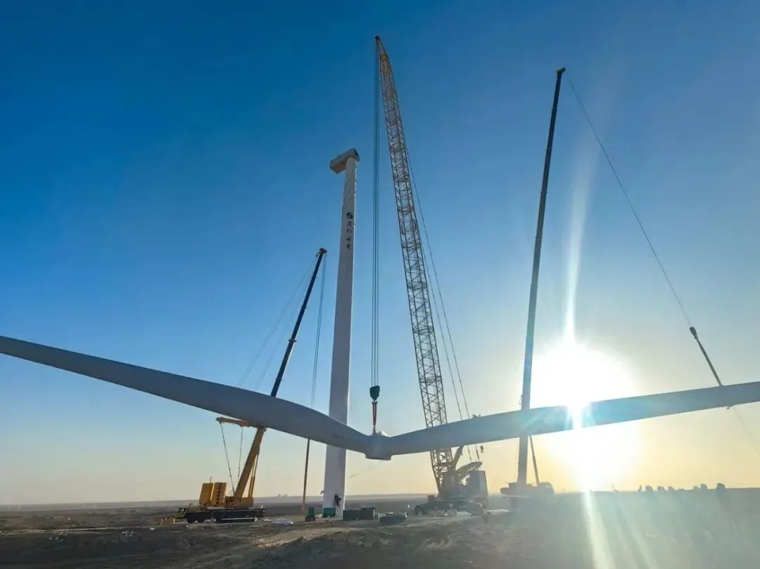 西北戈壁10萬千瓦風電項目現場,徐工輪履產品集聚,上演著多機協同的吊裝攻堅戰。