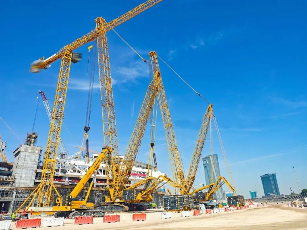 萬里之外的中東沙漠,2034年世界杯主場館建設現場,XGC15000A與XGC12000領銜組成"鋼鐵艦隊"。