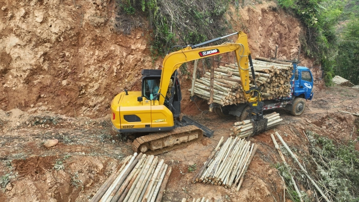 在鄭俊負責的林場,每節木材長度2.6米,徐工XE85GF一次可以夾10節以上的木材,重量超過1噸,而之前的輪挖夾裝0.6噸木材已是極限。