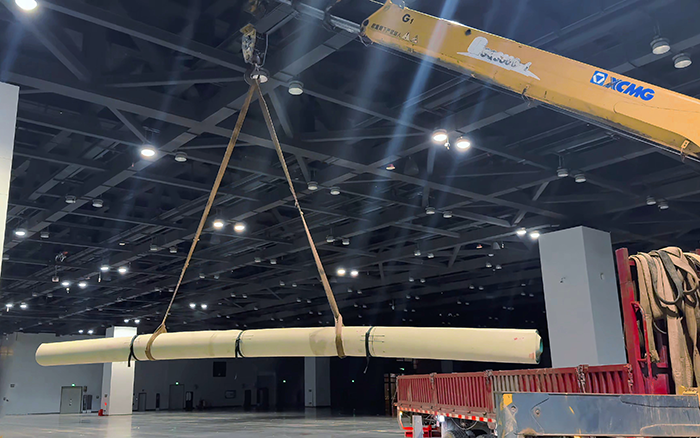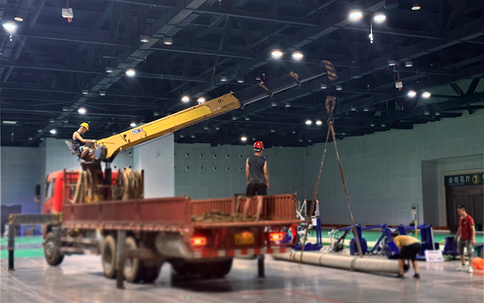 施工中,徐工隨車起重機憑借高強度鋼材打造的起重臂,展現出驚人的起重能力。吊運成卷塑膠卷材時,它動作流暢,如行云流水般將材料從貨箱卸下,穩穩送至場館指定鋪設位置。面對數噸重的特殊塑膠材料吊運難題,其四節臂體同步伸縮,輕松完成任務。“這設備的帶載能力遠超預期,再重、再難的吊運都不在話下!” 現場項目負責人對徐工隨車起重機的強大性能給予高度評價。