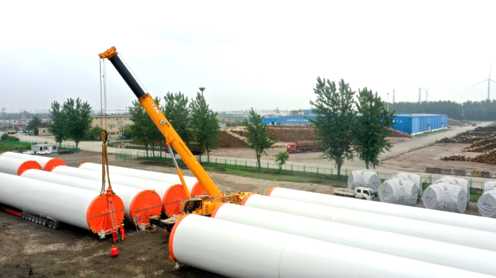在繁忙的港口,長40米、重100噸的風力發電塔筒擺放整齊,等待著一次關鍵的騰挪,吊裝空間局促——塔筒擺放距離較近,蕩距空間嚴重受限,這是對起重機性能與操控的極致考驗。徐工G2代起重機XCA200G8-1從容入場,以實力宣告:空間,絕非限制。
