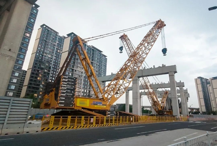 面對有限的操作空間,兩臺徐工XGC11000(650噸級)履帶起重機采用42米標準主臂工況,分別精準定位在梁體兩側(cè)狹窄區(qū)域內(nèi),將重達60噸的預(yù)制混凝土預(yù)制梁,穩(wěn)穩(wěn)吊離運梁車,梁體全程保持水平“懸浮”。