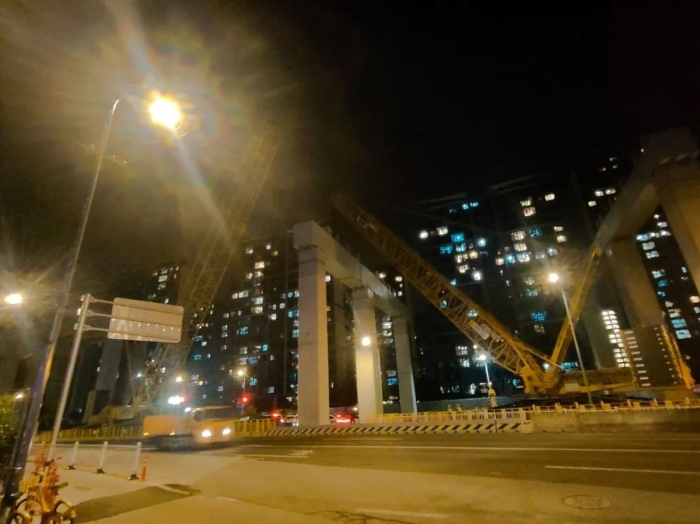 狹窄空間內(nèi),兩機協(xié)同微調(diào),在進行精確轉(zhuǎn)場移動的同時,也避免了任何晃動或扭轉(zhuǎn),重物分毫不差地平穩(wěn)落位至預(yù)定橋墩支座上,整個過程高效流暢,一氣呵成。