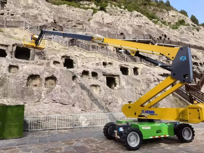 時間回溯到2021年,由于遭受多場暴雨侵襲,龍門石窟部分洞窟內(nèi)滲漏水嚴重甚至出現(xiàn)積水,部分山體表面巖石脫落、松動,嚴重威脅文物安全,急需得到有效治理。龍門石窟研究院隨即開展了為期1年多的“龍門石窟蓮花洞至石牛溪區(qū)域保養(yǎng)維護項目”。徐工XGS25ACK-Li直臂式高空作業(yè)平臺作為“得力助手”,深度參與各項保護修復(fù)工作。