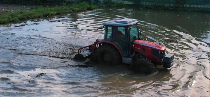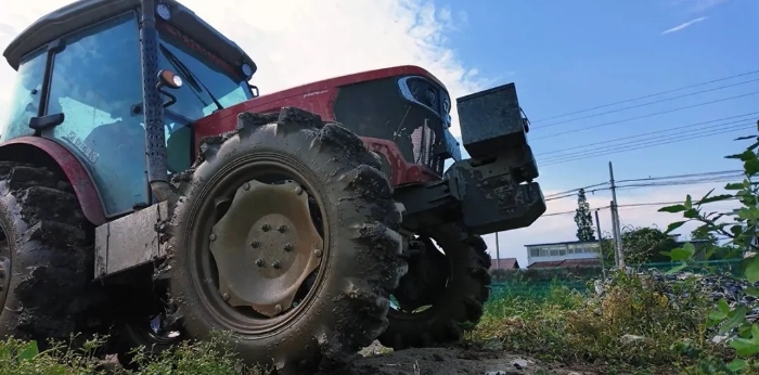 這臺機子配置高的很:用的大底盤,動力輸出軸也是加固強化過的,而且它標的是80匹馬力,實際藏著30%的儲備動力,可以達到90匹馬力,就算半個輪胎陷進去,也能輕松開出來,在水田這種復雜地方,是真省心。