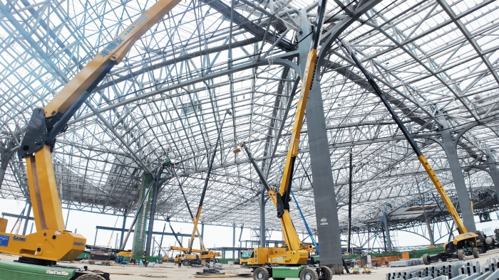 西安東站建設工地上,徐工高空作業平臺組成“鋼鐵軍團”正全速推進施工。10余臺30-40米直臂車伸展巨臂,精準對接站房屋頂鋼結構焊接;12米剪叉車靈活穿梭,高效配合內部砌墻作業。