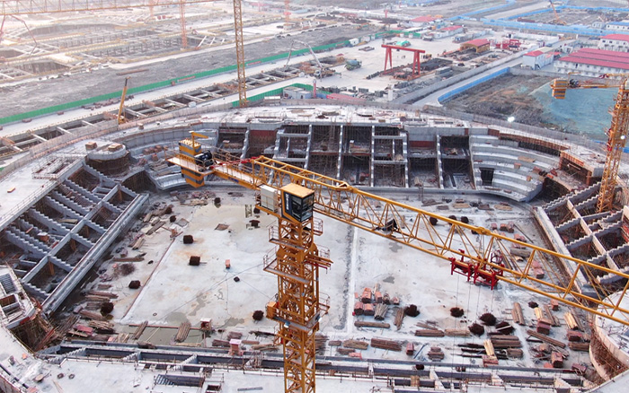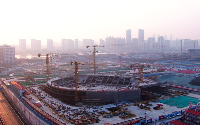 該項目造型獨特,主賽場區(qū)域結構復雜,同時采用大量的曲線設計,給現(xiàn)場鋼筋、水泥預制件的制作與安裝帶來了巨大挑戰(zhàn),也對塔機的綜合性能提出極高要求。