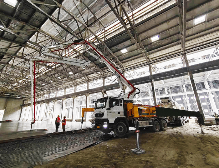 HB43V泵車搭載五節“RZ”型折疊布料桿,370°靈活旋轉無施工死角,憑借高效泵送能力適配大面積地坪連續澆筑需求,精準滿足C30混凝土強度與平整度標準。