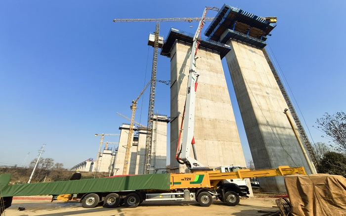 面對挑戰(zhàn),徐工72米泵車憑借71.2米的布料高度從容進(jìn)場,在密集的橋墩鋼架間游刃有余。配置540馬力超大發(fā)動機(jī)和雙190主泵,為連續(xù)高強(qiáng)度施工輸送澎湃動力。