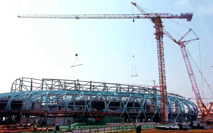 滁州奧體中心項目位于明湖景觀區域,規劃占地約1100畝,總建筑面積約13.4萬平方米,主要建設項目為一場兩館、含全民健身中心和大型體育生態公園。徐工塔機多臺XGT7022-12S產品參與滁州奧體中心項目建設,經過近一年的緊張施工,項目主體混凝土施工已基本完成,進入鋼構吊裝建設。